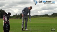 But keeping this under the lower part of your lead elbow, we can then go ahead and make ourselves a setup. Then quite a short backswing, and then hit through the ball. And at this point here, we want to feel like we haven't dropped the head cover. If during the swing the elbow comes up too early, too quickly, the head cover is going to fall out and fly forwards. So again we keep that under the lower part of the lead arm, and then backswing, through to the ball, backswing, through to the ball. Now you’ll feel very restricted. There's no doubt here. This is not full backswings. This is not full follow-throughs.